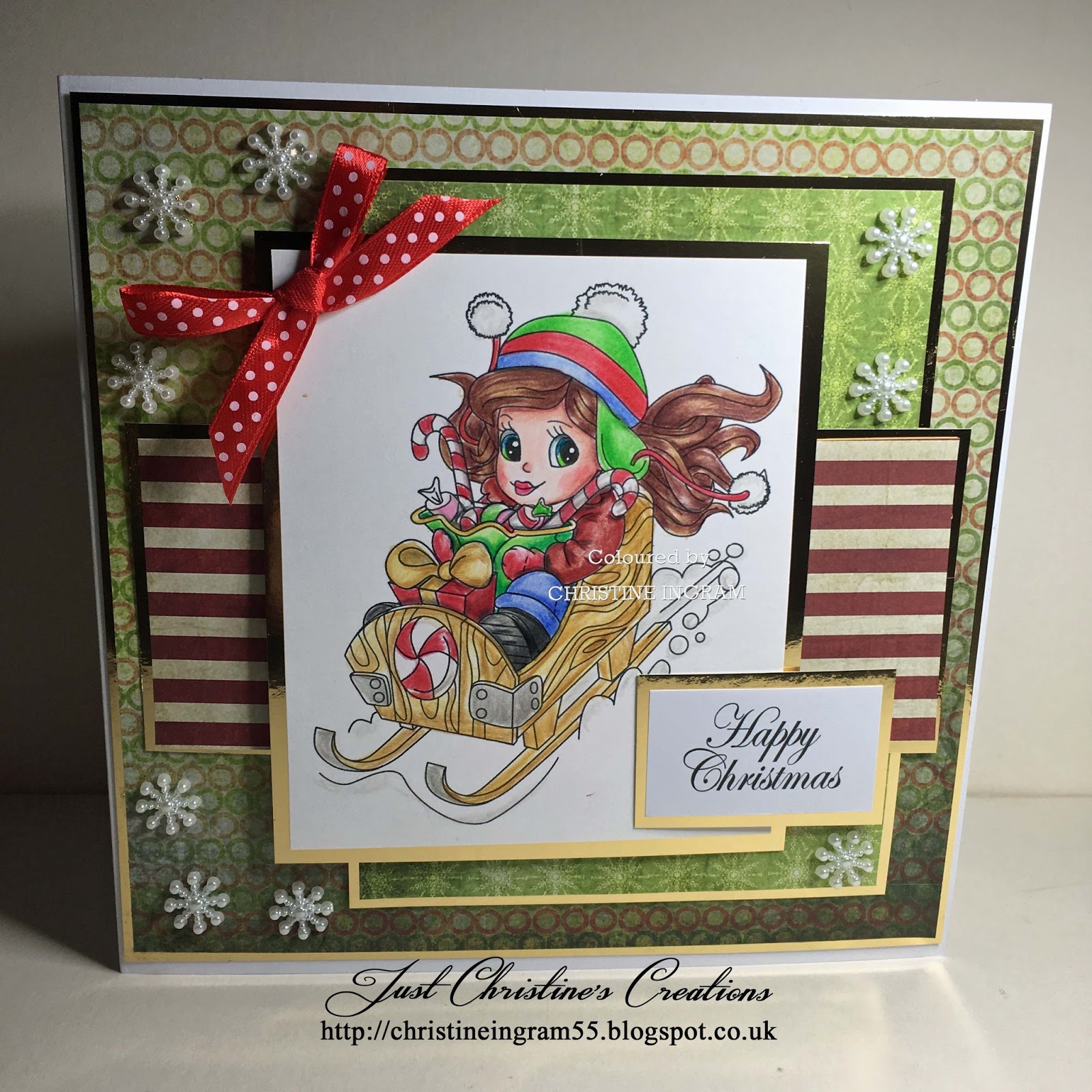 Hiya with sadness I am leaving Digital delights ,this last month I have been feeling very poorly and need to take some of the pressure off ..So sadly I have to say goodbye after a year with them.. I am still unwell..But had to do this one as it is my last one :) ..Sorry my work is suffering too ..Anyway enough misery .This super cute image was coloured using Polychromos Pencils onto Neenah Card and I have mounted her onto Gold card..The papers I have used are Tonic and the pad is Winter Wonderland..These also were mounted onto gold.,To decorate I added a gingham ribbon and some pretty character wooden buttons,which I mounted onto roughtly cut our circles and cut them around and cupped them up towards the button,,Gives a nice effect around the button and light bounces off at different angles ..I even put glitter on her too lol..Well suppose I have to do what is expected for Christmas, and it is for my young granddaughter too lol ..Thank you for popping by :)xx